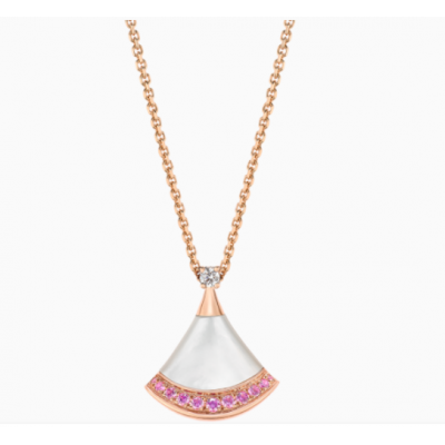 Divas' Dream系列18K玫瑰金项链精妙诠释欢愉女性魅力,以璀璨多彩的设计演绎标志性扇形图案。此系列的标志性美学元素通过精致的设计呈现,项链巧妙镶嵌白色珍珠母贝,更点缀粉色蓝宝石,将BVLGARI宝格丽对罗马文化的传承体现得淋漓尽致。这款作品是为庆祝七夕情人节打造的特别款,优雅隽永,礼赞自然之美。 Divas' Dream系列18K玫瑰金项链,镶嵌珍珠母贝、一颗圆形明亮式切割钻石和粉色蓝宝石。