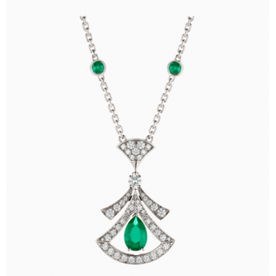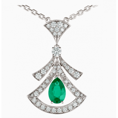 DIVAS’DREAM系列项链体现意式优雅魅力,以神秘且令人难以忘怀的气质,释放女性力量。充满女性魅力的精致扇形图案,从罗马卡拉卡拉大浴场(Baths of Caracall)的多彩马赛克装饰中汲取灵感,以意大利式优雅魅力的精髓彰显Bvlgari宝格丽同“永恒之城”罗马之间的历史渊源。精致而轻巧的镂空设计重新诠释该系列的经典造型,演绎着虚实之间的魅力。Divas' Dream系列白色18K金镂空项链,镶嵌1颗梨形祖母绿、圆形明亮式切割祖母绿、1颗圆形明亮式切割钻石,饰以密镶钻石。
